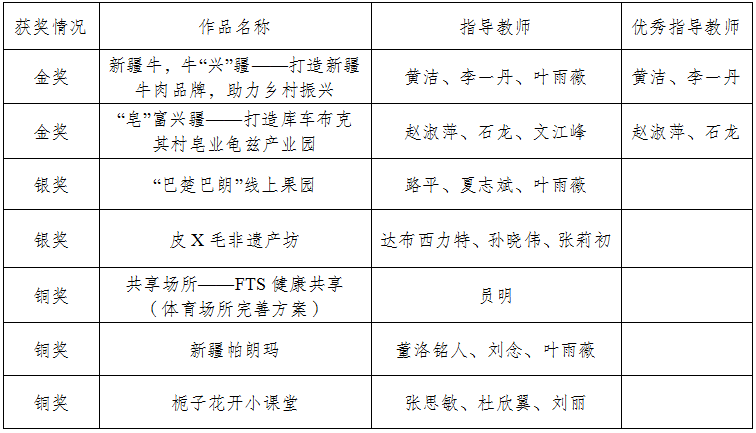 近日,新疆维吾尔自治区首届大学生乡村振兴创意大赛获奖名单公布,我校报送的作品通过层层选拔,在自治区的1060个团队中脱颖而出,荣获2项金奖,2项银奖,3项铜奖,4位教师荣获“优秀指导教师”称号,1位教师荣获“先进工作者”称号,我校荣获“优秀组织奖”。获奖名单如下: